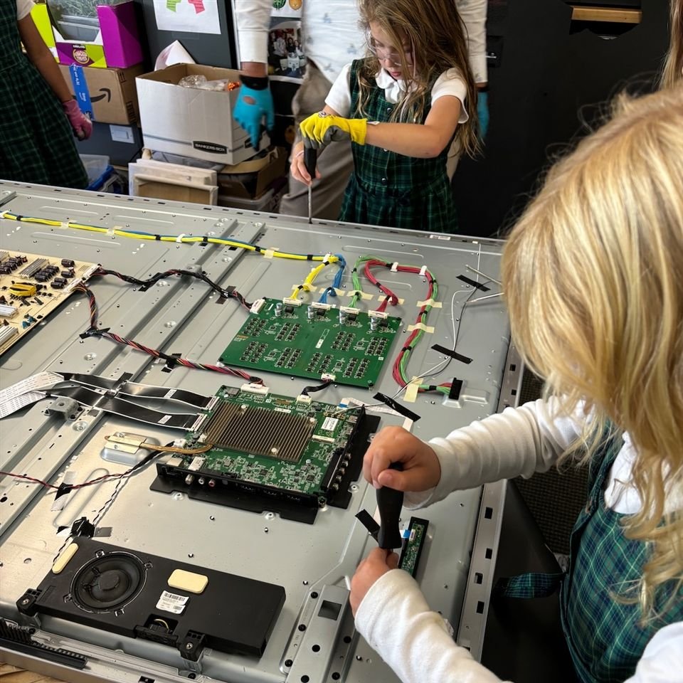 In late October and early November, the Class of 2030 studied discarded toys, electronics, and other mechanisms by taking them apart. Items included robotic dogs, cell phones, coffee machines from home, old Macbooks, printers, and a huge flat-screen television donated by the Tech department! The third graders gained confidence using screwdrivers, tweezers, and arm strength to take everything apart.