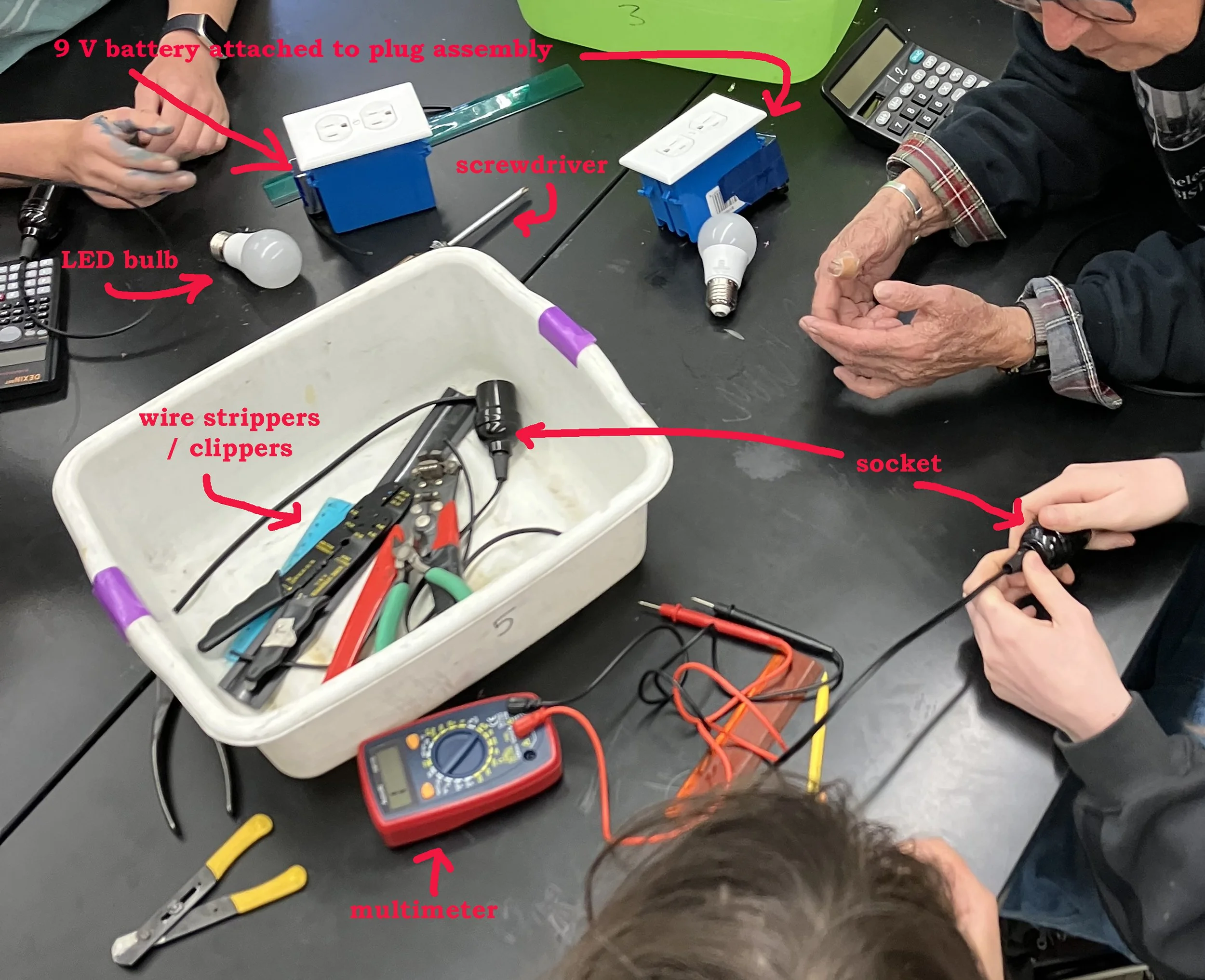 Cindy assembled components into simple, operational “lamps” and table-top outlets, then each lamp assembly was strategically “broken” in a way that was not readily apparent, but required disassembly and exploration to find a snipped wire inside either the plug or the socket. One kit served two students, and a community volunteer oversaw and offered guidance to two to three pairs of students (lower ratios are preferable).