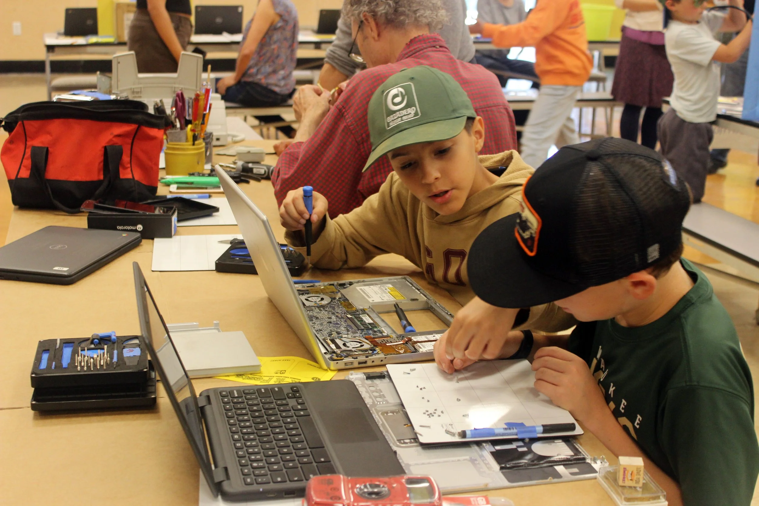 Students at the take-apart table at Fix-it Fest 2024, Willard Middle School, Berkeley Unified School District, California USA