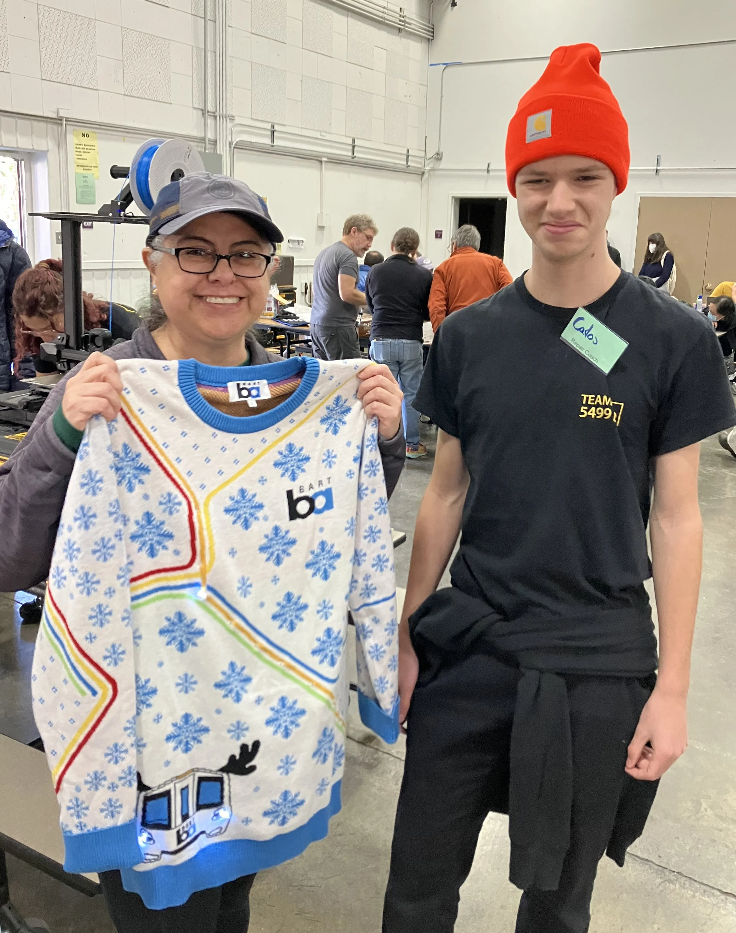 Carlos Johns of BUSD Robotics Club and Fix-it Fest participant, after re-soldering her light-up BART sweater.
